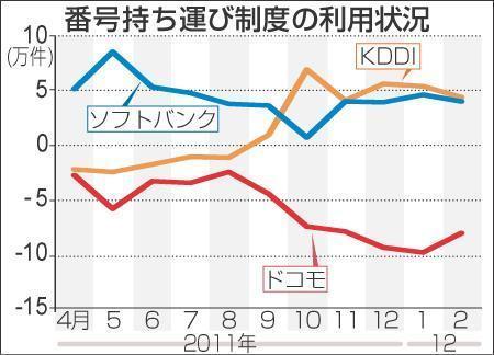 KDDIは昨年8月まで17カ月連続で転出超過だったが、米アップルの人気スマートフォン(高機能携帯電話)「iPhone(アイフォーン)」の販売直前の昨年9月から6カ月連続でMNPが転入超過となった。同10月からはMNPで首位を続けている。