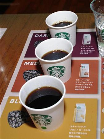 手前からスターバックスの新商品のブロンドと従来品のミディアム、ダーク【拡大】
