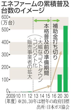 都市ガスなどから水素を取り出して発電する家庭用燃料電池「エネファーム」の普及目標は2030年までに累計530万台で、11年度実績の約230倍に上る。普及に向けた補助金が15年度で打ち切られることもあり、既に「むちゃな目標設定だ」(業界関係者)との指摘が出ている。