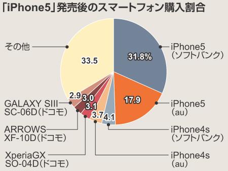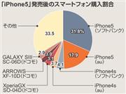 アイフォーン5はKDDI(au)とソフトバンクモバイルの両社が販売しているが、両社の購入比率はauが36.1%、ソフトバンクが63.9%と差がついた。