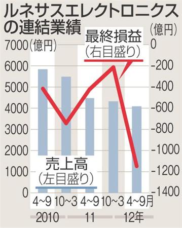 経営再建中の半導体大手、ルネサスエレクトロニクスが29日発表した2012年9月中間連結決算は、早期退職優遇制度に伴う840億円の特別損失を計上したことなどから、最終損益が1150億円の赤字(前年同期は420億円の赤字)となった。赤字額は2010年の設立以来上期として過去最大。