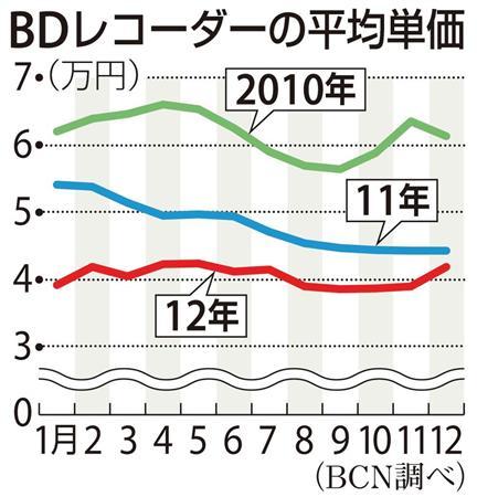 BCNによると、全国の家電量販店2448店舗でのBDレコーダーの1月の平均単価は3万8600円。10年1月の6万2000円から4割近く下落した。