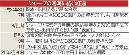 シャープ側は「交渉のボールは鴻海にある」としているが、現時点で鴻海側からの具体的な回答はなく、「鴻海から出資を受けるのは無理だろう」(金融関係者)との見方が大勢を占めている。