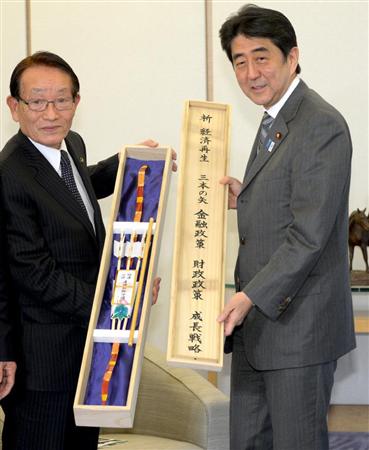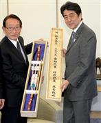 広島県安芸高田市の浜田一義市長(左)から「三本の矢」を贈られ、「祈経済再生」などと書かれた木箱のふたを手にする安倍晋三首相=25日午後、首相官邸(酒巻俊介撮影)【拡大】
