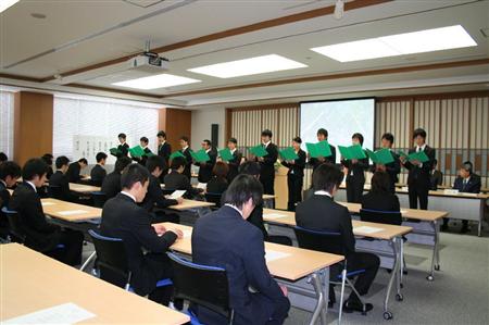 「5Sの歌」を新人社員の前で熱唱する2年目の社員ら(大日本スクリーン製造提供)【拡大】