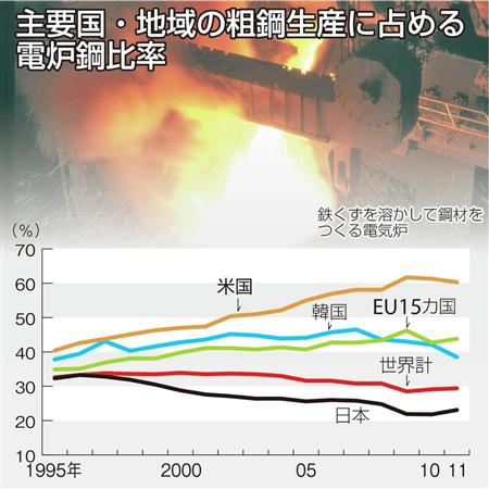 電炉メーカーは鉄くず(スクラップ)を再利用して鋼材を生産し、粗鋼生産量の2割を占める重要な産業だけに、経営危機や廃業が相次げばその影響は産業全体に及ぶことは避けられない。高付加価値化や新興国への進出など生き残りを模索する動きも出てきたが、即効性は薄く、存亡の危機が続いている。