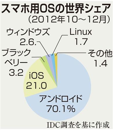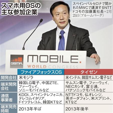 スマートフォン(高機能携帯電話)用の新たな基本ソフト(OS)「TIZEN(タイゼン)」がシェア20%獲得に向けて活動を本格化する。OS開発企業には今月中にも世界最大の通信機器メーカー、中国ファーウェイが加わり、米インテル、韓国サムスンとともに主導する。日本企業では、NECと富士通も来年後半に対応端末を投入する。米グーグルの「アンドロイド」とアップルの「iOS」で9割以上を占めるスマホ用OS市場の勢力図を塗り替える可能性も出てきた。