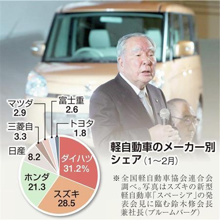 この分野での商品戦略の甘さが、長年守ってきたシェア3割を昨年割り込む事態へ導いたとの反省があるからだ。ライバルのダイハツ工業に対する追撃態勢を整えるが、背後からは「N BOX」などヒットを飛ばし、2強の牙城を崩しにかかるホンダが迫る。混戦の軽市場を制するには、弱点分野の克服は待ったなしだ。
