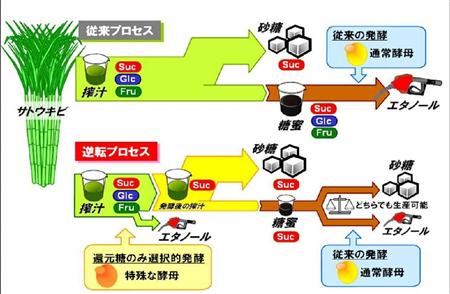 サトウキビにはショ糖、ブドウ糖、果糖の3種類の糖が含まれているが、砂糖を生成するのはショ糖のみ。従来工程では、サトウキビの絞り汁をショ糖とそれ以外の糖分(還元糖)に分解した上で、ショ糖のみを砂糖として回収し、残った還元糖に酵母を加えてエタノールを生成していた。