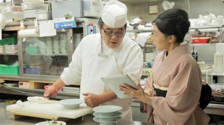 クラウドコンピューティングや情報端末を使い、急な宿泊内容の変更などを確認する老舗温泉旅館「陣屋」の従業員=神奈川県秦野市(同館提供)【拡大】