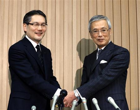 資生堂社長交代会見。会見後握手を交わす、社長を兼務する前田新造会長(右)と体調不良で社長を退任し相談役に就任する末川久幸社長(左)【拡大】