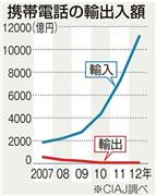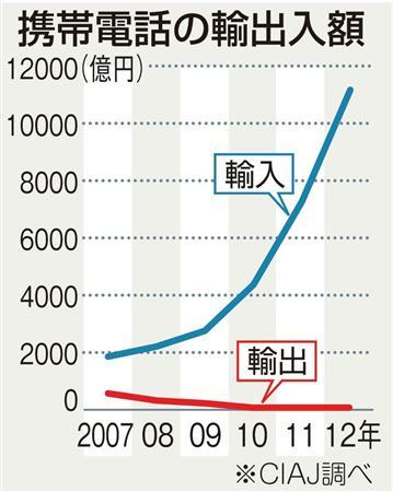 携帯電話の輸入超過に歯止めがかからない。2012年の輸入額は統計開始以来初めて1兆円を超えた。