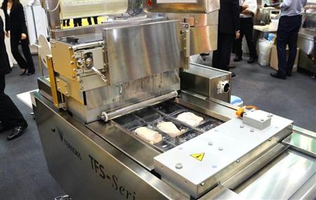 食品包装機械などを手掛ける寺岡精工(東京都大田区)の「ノントレイ包装機」は、発泡トレイやラップを使わずに食肉や魚の切り身などを真空パックできるのが特長で、鮮度保持や作業コスト削減に効果があるという。ターゲットは餃子やハンバーグの具、味付け肉といった調理に手間を取らない食材を扱うスーパー。さらに1人分に個別包装した商品を展開するコンビニエンスストアやファミリーレストランにも攻勢を掛ける。