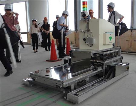 大林組は21日、2014年開業を目指す森ビルの超高層ビル「虎ノ門ヒルズ」(東京都港区)の建設現場に導入している資材搬送ロボットを公開した。人手に頼っていた作業を効率化でき、東日本大震災後の復旧・復興需要などによる全国的な作業員の人手不足の解消に役立つと期待している。同社によると、建設現場でロボットが作業をするのは業界で初めてという。