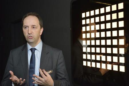 有機EL照明「リビングシェープスインタラクティブミラー」について説明する有機EL事業開発マネージャーのディートマー・トーマス氏【拡大】