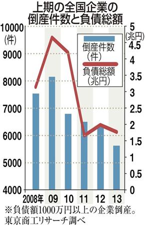 民間調査会社の東京商工リサーチが8日発表した2013年上期(1~6月)の全国の企業倒産件数(負債総額1000万円以上)は前年同期比10.9%減の5620件で、上期としては、1991年(4723件)以来22年ぶりの低水準となった。負債総額も10.4%減の1兆7987億円で、過去20年間で2番目に少なかった。