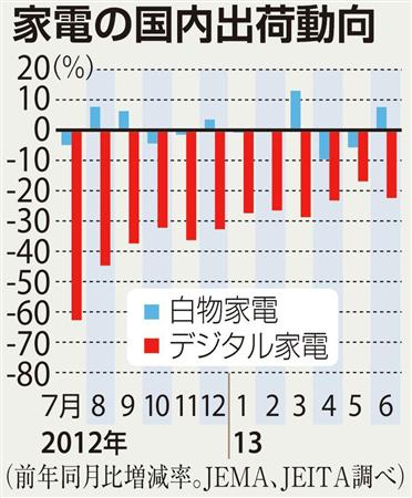 エアコンや冷蔵庫などの白物家電が好調に売れ始めた。日本電機工業会(JEMA)が22日発表した6月の白物家電の国内出荷額は、前年同月比7.6%増の2690億円と3カ月ぶりのプラス。猛暑に加え、安倍晋三政権の経済政策「アベノミクス」による景気好転への期待感を背景に高い伸びを示した。半面、薄型テレビを中心とするデジタル家電は23カ月連続のマイナスとなり、明暗を分けた。