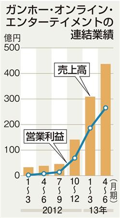 新興ゲーム会社のガンホー・オンライン・エンターテイメントが29日発表した2013年6月中間連結決算は、売上高が前年同期比10.4倍の746億円、本業のもうけを示す営業利益は44倍の451億円といずれも過去最高を更新した。