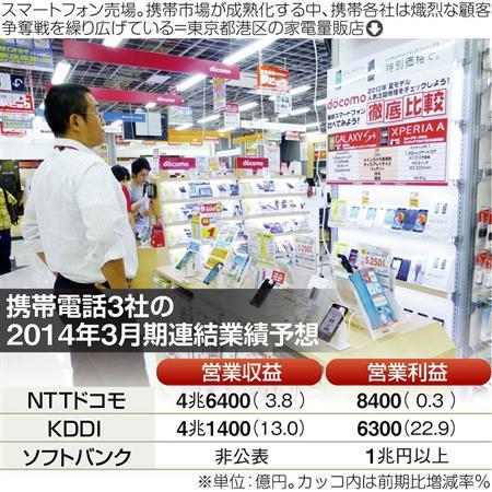 顧客流出が続くNTTドコモは売れ筋端末を絞り込む戦略を継続する一方、米アップルのスマートフォン(高機能携帯電話)「iPhone(アイフォーン)」投入も引き続き検討。新規事業での収益増も狙う。携帯3社は成熟期を迎える国内で熾烈(しれつ)な顧客争奪戦を繰り広げる一方、新たにグローバル展開や新規事業拡大にも挑む。