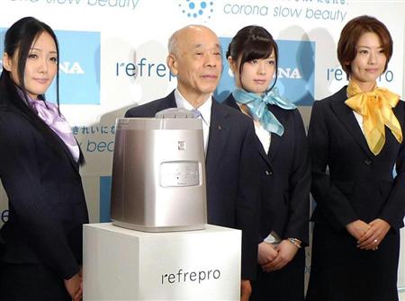 美容機器の「リフレプロ」を発表するコロナの内田力社長(左から2人目)=東京都渋谷区【拡大】