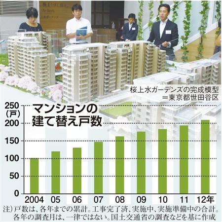 不動産大手各社が、老朽化したマンションや団地の再生事業を加速している。居住者の間に、高齢化に伴うバリアフリーへの要求や東日本大震災を契機とした耐震性能への不安が高まっていることが、建て替え需要拡大の背景にある。既存建物を対象とするストックビジネスの強化は、各社共通の課題。このため建て替え事業に弾みがつくことが期待されるが、居住者の合意形成が進みにくいというハードルもあり、事業をどこまで拡大できるかは未知数だ。