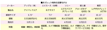 米アップルがタブレット端末の新製品「iPad Air(アイパッドエア)」を発表したことで、タブレット市場は一段と活気づきそうだ。ただ、端末自体の差別化が難しく、価格競争も厳しさを増しているのが現状で、ソニーや富士通などの日本勢は、王者・アップルに少しでも近づくべく、法人向けの開拓を急ぐ。