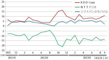 携帯キャリア各社が発表した9月の携帯電話契約状況でKDDI(au)は、同じ電話番号で通信事業者を変更できる番号持ち運び制度(MNP)による顧客転入数で24カ月連続の首位を達成した。9月の転入数は11万800件に達し、2013年3月に次ぐ高い水準で、引き続き好調を維持している。