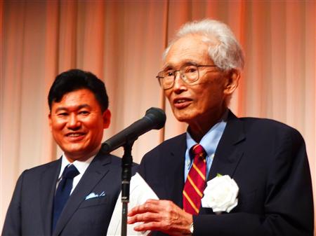 実子の三木谷浩史楽天会長兼社長(左)と親子で書籍を出版、あいさつする三木谷良一神戸大名誉教授=9月5日、東京都内(早坂礼子撮影)【拡大】