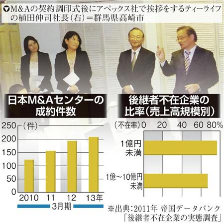 経営者の高齢化などで後継者不在の中小企業が、M&A(企業の合併・買収)に活路を見いだすケースが増えている。中小企業のM&A仲介で大手の日本M&Aセンターは、2013年3月期に成約件数が初めて200件を突破。今期もそれを上回るペースで推移する。地方には後継者はいないが黒字経営で価値が高い企業は多く、今後、さらに注目度が高まりそうだ。