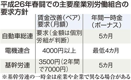 一方、電機連合も、政府の賃上げ要請や連合の方針も踏まえ、「賃金改善を要求する環境が整った」(幹部)と判断。ベア要求を5年ぶりに行い、月4千円以上を統一要求する。基幹労連は2年間で計7千円のベアを要求。ベア要求は6年ぶりで、金額は前回要求額の2倍を超える。