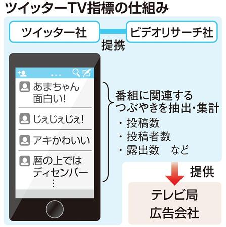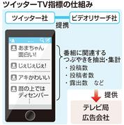 ビデオリサーチが新たに導入するのは、「ツイッターTV指標」。番組ごとに題名や出演者、せりふといった関連語を抽出し、ツイッターでの投稿数や投稿者数などを集計する。在京キー局の地上波番組すべてを対象にサービスを始める予定だ。
