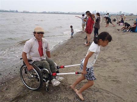 子供でも足場の悪い砂浜で車いすを動かすことができる【拡大】