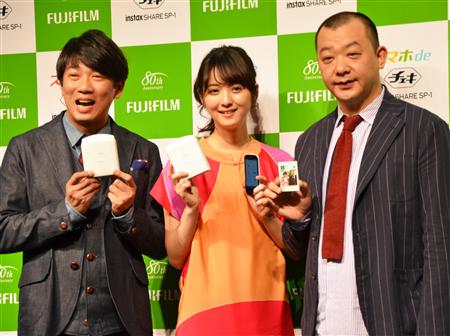 スマホdeチェキをPRするタレントのTKOと女優の佐々木希さん(中央)=15日、東京都港区(小島清利撮影)【拡大】