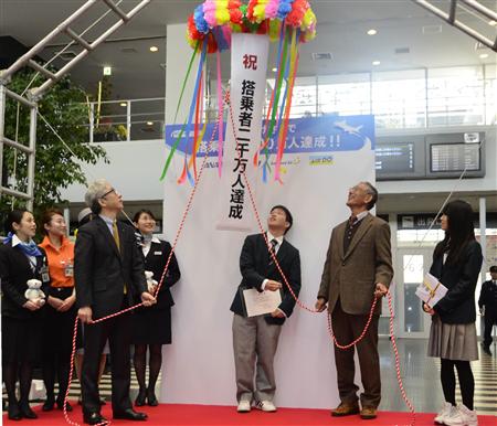セレモニーでは2千万人達成を祝ってくす玉が割られた=15日、神戸市中央区の神戸空港【拡大】