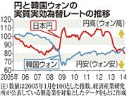 独立行政法人経済産業研究所は27カ国の通貨を対象に2005年基準の実質実効レートを算出している。これによると08年秋のリーマン・ショック後に急速に進んだ円高により円がウォンを上回った。投資家が安全資産とされる円を買う姿勢を強めたためだ。