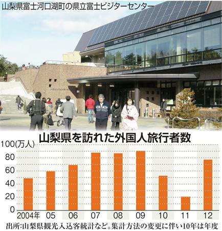 1月初旬の平日、富士山観光の入り口となる山梨県立富士ビジターセンター(富士河口湖町)は多くの外国人でにぎわい、台湾人の団体客や欧米、イスラム圏の旅行者が富士山の自然環境を紹介する展示を熱心に見ていた。