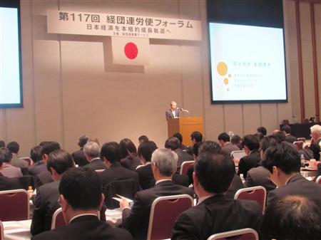 企業の経営者や人事・労務担当者約250人が参加して春季労使交渉の課題を話し合う第117回労使フォーラムが27日、東京都内で始まった。基調講演した経団連の篠田和久副会長(王子ホールディングス会長)は「成長実現には民間活力を最大限に発揮することが不可欠だ」と強調し、労使協調の重要性を訴えた。同日午後は米倉弘昌会長もあいさつし古賀伸明連合会長が講演。2014年春闘が本格スタートした。