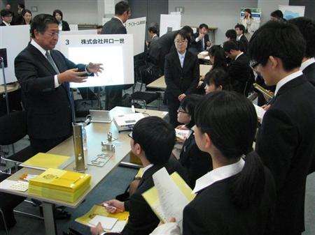 各社のブースには、リクルートスーツ姿の学生が詰めかけ、社長や採用担当者から事業戦略や採用日程、待遇などについて説明を受けた。精密部品加工の井口一世(埼玉県所沢市)の井口一世社長は「何事にもあきらめない強い意志を持った人に来てほしい」と呼びかけた。