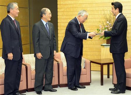経団連など経済3団体の首脳は10日、官邸に安倍晋三首相を訪ね、環太平洋戦略的経済連携協定(TPP)交渉の早期妥結を求める連名の要望書を手渡した。