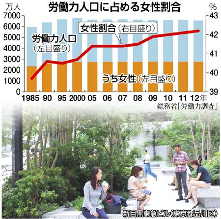 大手不動産各社が都心のオフィスビル開発で、ワーキングマザーら働く女性のニーズを反映させる動きが広がっている。雇用者に占める女性の割合が増加傾向なのに加え、政府が女性活用を成長戦略の柱に据えたことで、今後は出産後も働く女性の数が増える見込みだ。企業テナント誘致で「女性に優しいオフィス」を付加価値に競争力を高める狙いがある。
