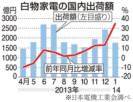品目別では、エアコンが47・0%増の462億円と8カ月連続のプラス。1月単月では昭和47年の調査開始以来、過去最高を記録した。このほか、冷蔵庫は82・7%、洗濯機は38・9%それぞれ伸びた。