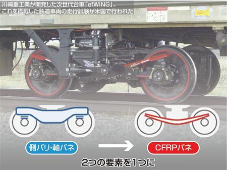 川崎重工業が開発した鉄道車両の新型台車「efWING(イーエフウィング)」。世界で初めてというCFRP(炭素繊維強化プラスチック)を採用した特殊な構造により、軽量化による省エネ性能の向上に加え、脱線に対する安全性や乗り心地も高めている。川崎重工は鉄道車両を中核事業の1つと位置付けており、「次世代の台車」として国内外で売り込む。