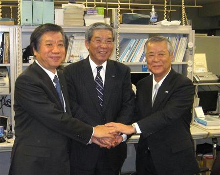 MS&AD社長に内定した柄沢康喜氏(左)、現社長の江頭敏明氏(中)、会長に内定した鈴木久仁氏【拡大】