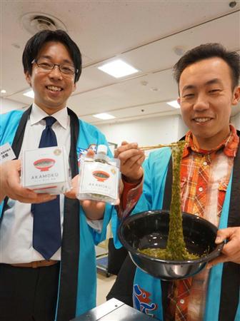 松坂屋上野店(東京都台東区)は11日まで、ヤフーと共同で東北物産展を開いている。5日には海草のアカモクを使った商品が会場で披露された。岩手、宮城両県の生産者が共同で取り組んでおり、岩手アカモク生産協同組合の高橋清隆代表理事は「アカモクの知名度を上げて販路を作り、浜の漁師の収入を安定させたい」と意気込む。