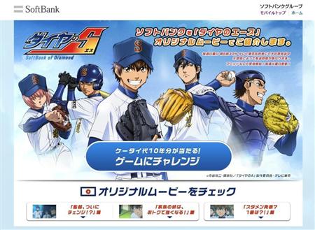 同社の公式サイト内に、野球の名門高校を舞台に繰り広げられる「ダイヤのA」の主人公らが登場する特設サイトを用意。同社が取り扱う携帯機器の割引プラン「ホワイト学割 with家族2014」やスマートフォン(高機能携帯電話)の「つながりやすさ」を紹介する動画、オリジナルゲームを提供する。