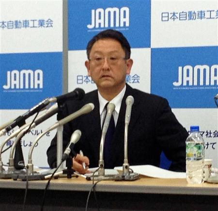 会見する自工会の豊田章男会長(トヨタ自動車社長)=20日、東京都港区(飯田耕司撮影)【拡大】