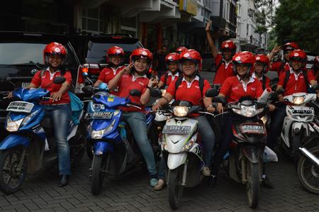 量販店に向け出発するグリコの「赤ヘル部隊」。そろいのユニフォームやヘルメットは、日本発のアイディアだ=2月11日、インドネシア・ジャカルタ市【拡大】