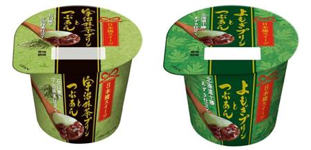 協同乳業「日本橋スイーツ」シリーズの新フレーバー2品「宇治抹茶プリンとつぶあん」(左)と「よもぎプリンとつぶあん」【拡大】