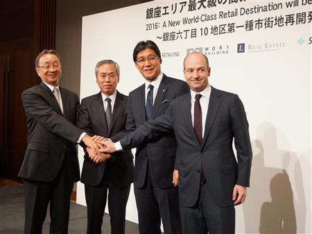 松坂屋銀座店の跡地などに建設する複合施設について記者会見したJ・フロントリテイリングの山本良一社長(右から2人目)、森ビルの辻慎吾社長(同3人目)ら=2日、東京都千代田区【拡大】