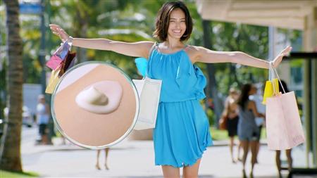 ロケ地は、ワイキキのメーンストリート「カラカウア通り」。買い物客や車を避けながら、1日かけて撮影した。CMは水色のドレスを着た長谷川が、たくさんの買い物袋を両手に抱え闊(かつ)歩(ぽ)するシーンから始まる。